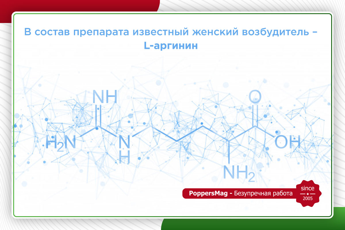 В состав препарата известный женский возбудитель – L-аргинин. В качестве вспомогательных веществ используются экстракты натуральных трав, которым находят применение в современной китайской медицине. Благодаря такому составу происходит воздействие на организм женщины в целом. После приема препарата вы почувствуете сильное возбуждение и сексуальное влечение, забудете о стеснении и сможете полностью окунуться в волну страсти.