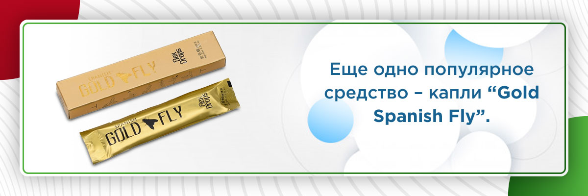 Еще одно популярное средство, схожее по действию с “Женской Виагрой” и ее заменителями, – капли “Gold Spanish Fly”. Этот препарат также стимулирует прилив крови к органам малого таза. Капли повышают уровень возбуждения и способствуют полному сексуальному раскрепощению.