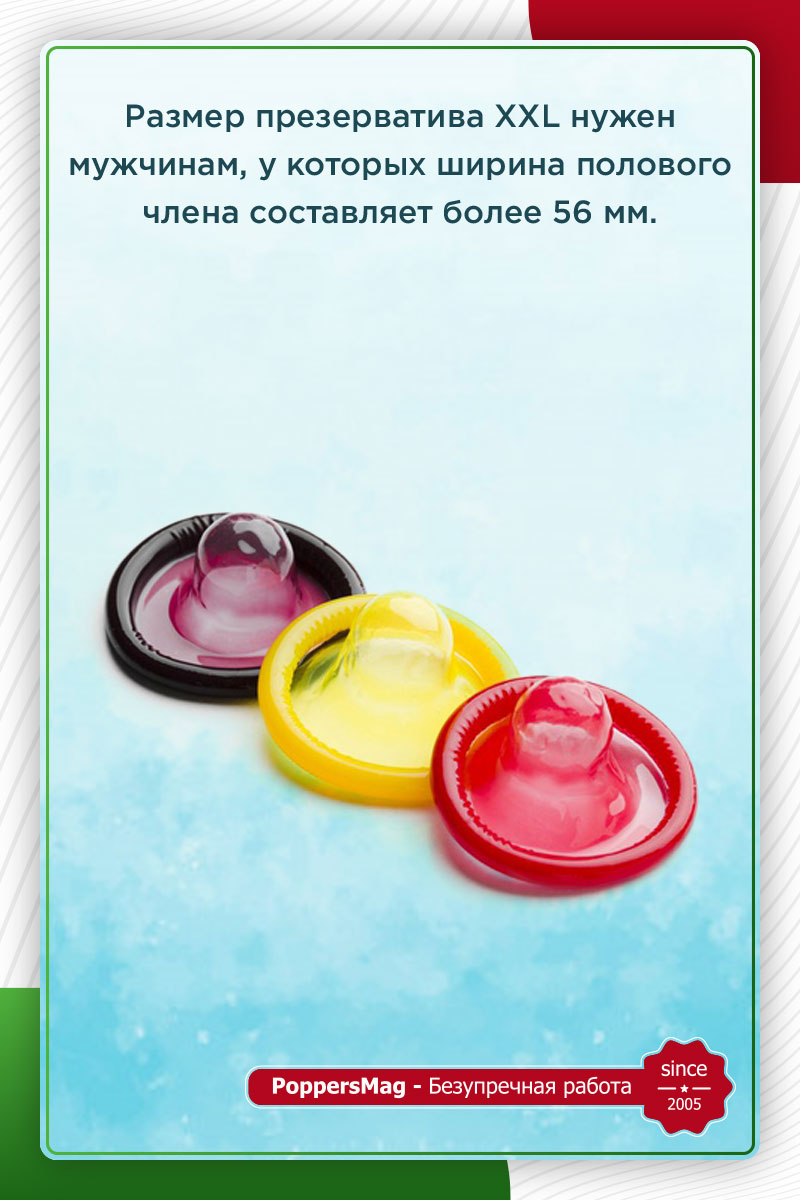 Размер презерватива XXL нужен мужчинам, у которых ширина полового члена составляет более 56 мм. Такие изделия также довольно сложно найти на полке обычного супермаркета. Лучше всего посетить магазин интимных товаров или поискать подходящие презервативы в аптеках. Помните о том, что в выборе контрацептива необходимо ориентироваться на реальные размеры своего достоинства, а не желаемые. Слишком большой контрацептив не только испортит ощущения во время секса, но и сделает его менее защищенным.
