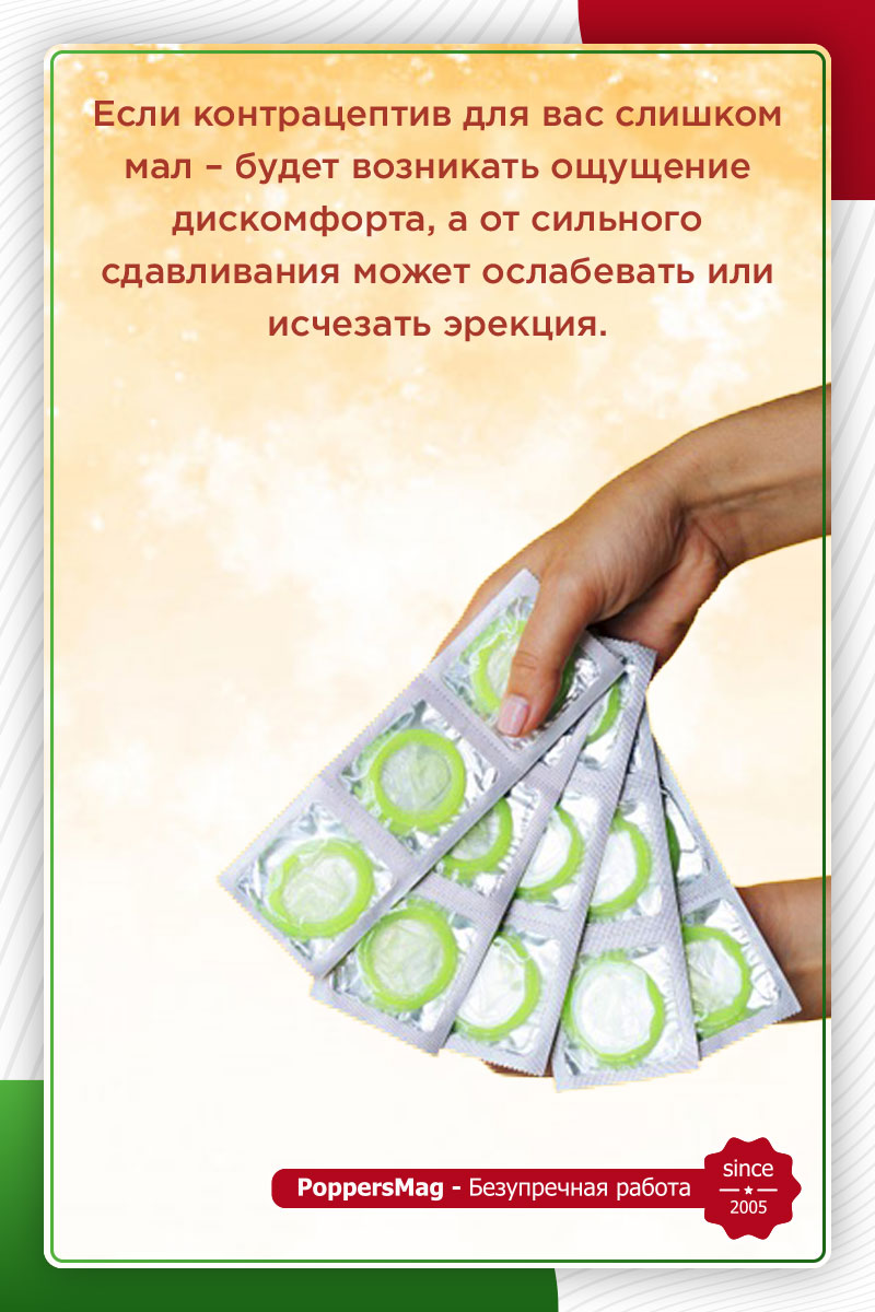 Естественно, презервативы имеют свои размеры, правильное определение которых влияет на качество их использования. Если контрацептив для вас слишком мал – будет возникать ощущение дискомфорта, а от сильного сдавливания может ослабевать или исчезать эрекция. Также такой презерватив может разорваться во время использования.