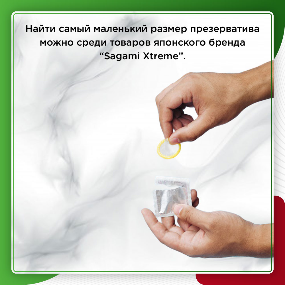 Найти самый маленький размер презерватива можно среди товаров японского бренда “Sagami Xtreme”. У них есть контрацептивы “Sagami Xtreme Cobra”, главной особенностью которых является минимальная ширина основания. У самого основания ширина такого презерватива составляет всего 4,4 см, что может стать отличным решением проблемы мужчин, у которых половой член имеет ширину, меньше стандартной.