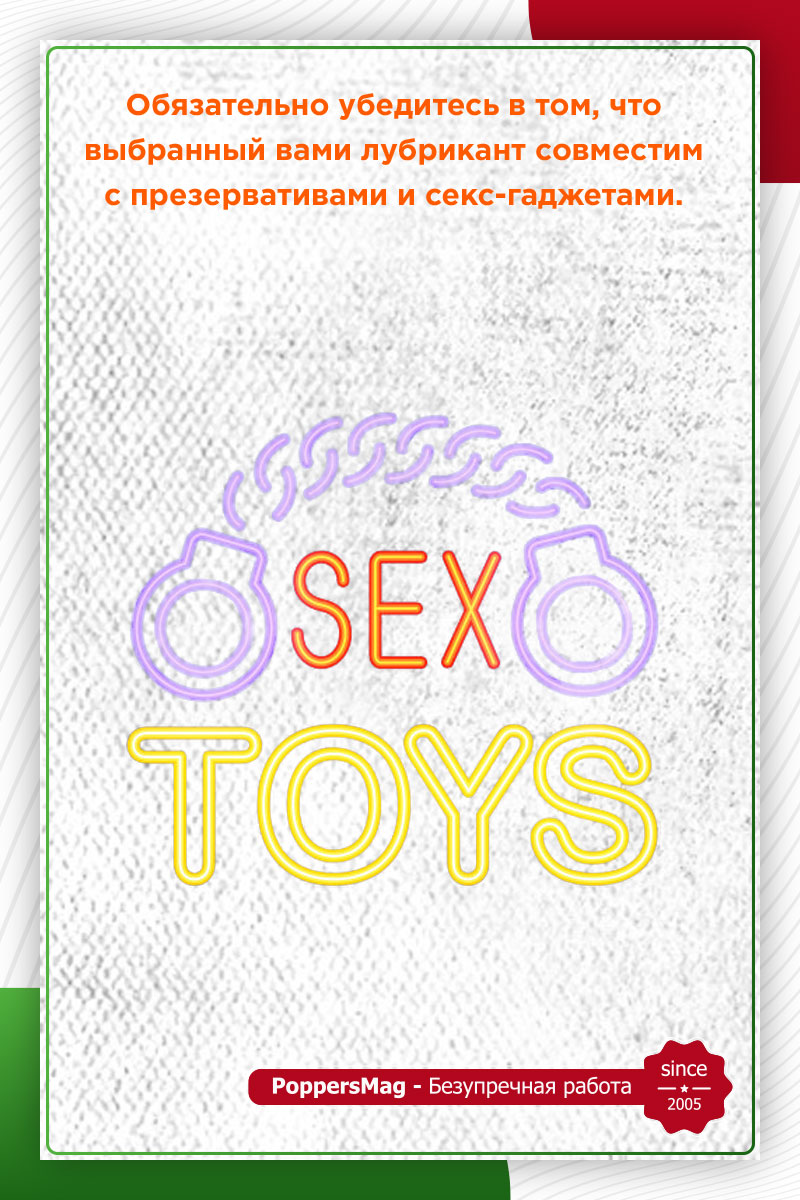 Обязательно нужно убедиться в том, что выбранный вами лубрикант совместим с презервативами или игрушками, которые вы собираетесь использовать. Например, масляный лубрикант не подходит для использования с презервативами, ведь масла, которые входят в его состав, могут разрушать оболочку контрацептива. Силиконовые смазки также могут действовать разрушающе на латексные презервативы и секс-игрушки. Поэтому перед началом использования также следует читать инструкцию.