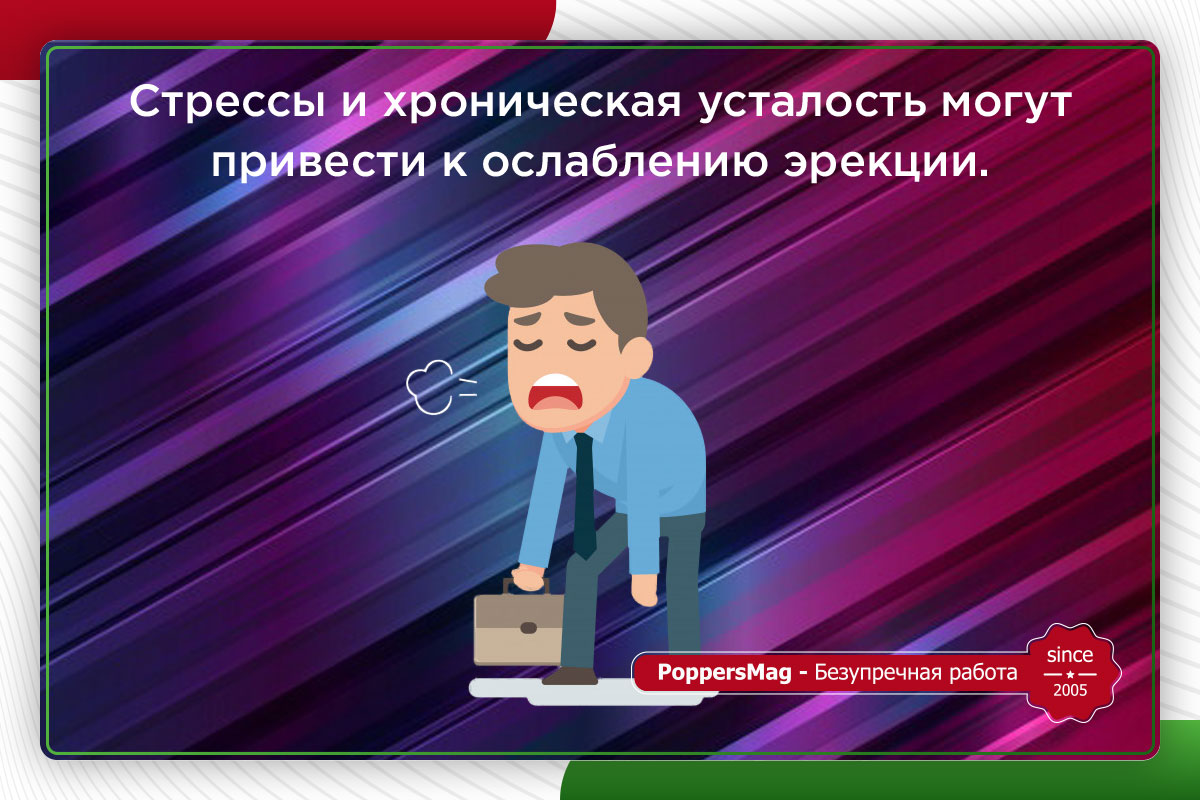 Психологические причины ухудшения эрекции встречаются довольно часто. К ним относятся стрессовые ситуации, неврозы, хроническая усталость, связанная с недосыпанием или напряженной работой. Также нередко мужчины, пережившие одну неудачу в постели, на подсознательном уровне ожидают “провала” и в следующий раз. Если ваши проблемы имеют именно такой характер – обязательно обратитесь к сексологу, он поможет разобраться в ваших переживаниях и наладить сексуальную жизнь.