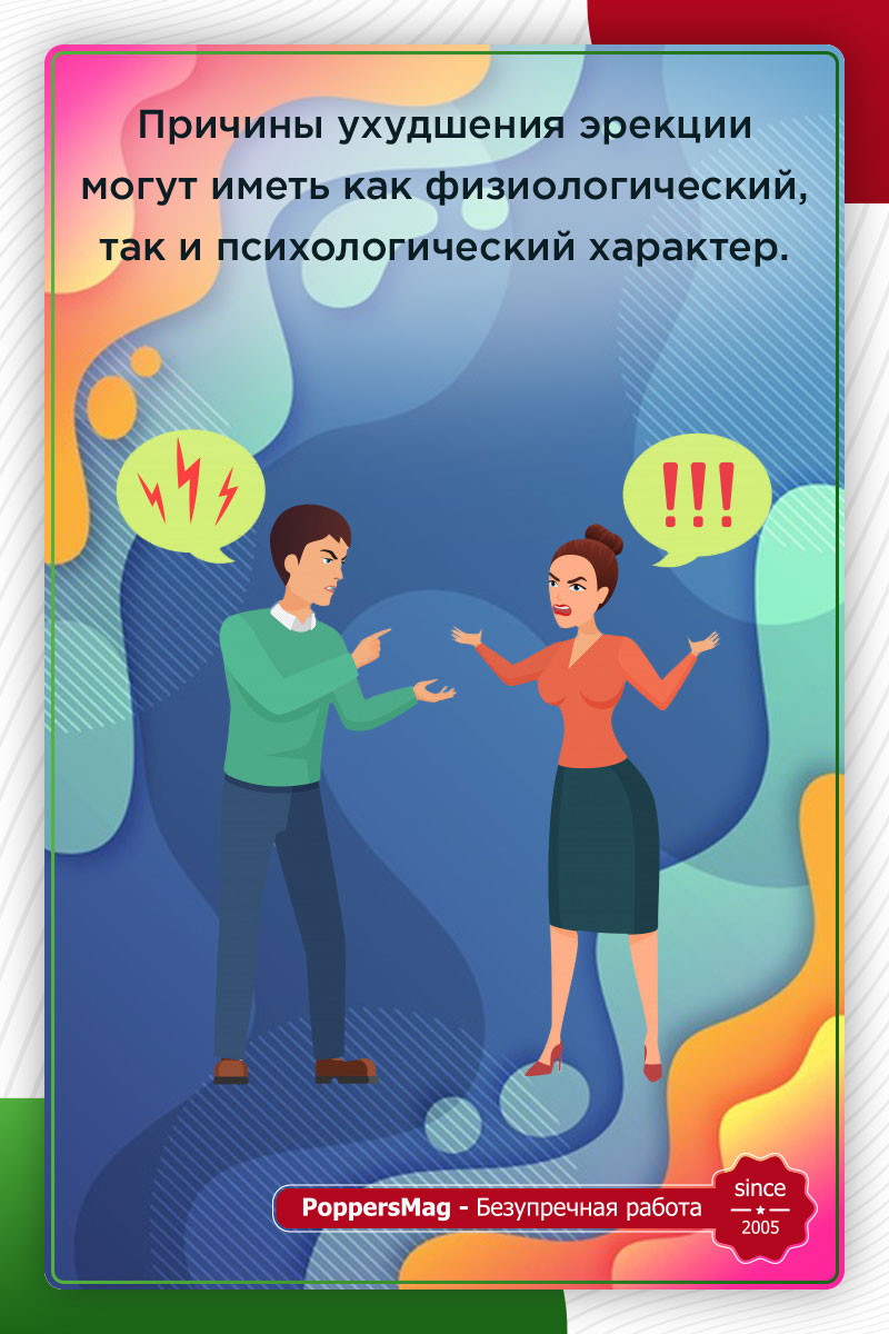 При этом, причины ухудшения эрекции могут иметь как физиологический, так и психологический характер. Важно понимать, что эмоциональное состояние весьма влияет на вашу мужскую силу. В современном мире стрессовые ситуации ожидают нас на каждом шагу. И если вы очень остро на них реагируете – риск возникновения эректильной дисфункции резко увеличивается. Именно поэтому всегда лучше посетить психолога, который поможет разобраться в ваших проблемах. Тем самым вы предотвратите возможность ухудшения потенции.