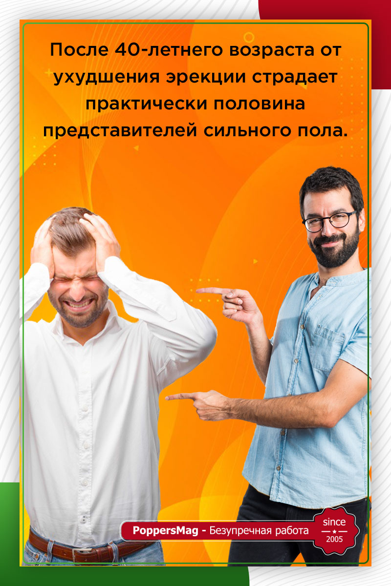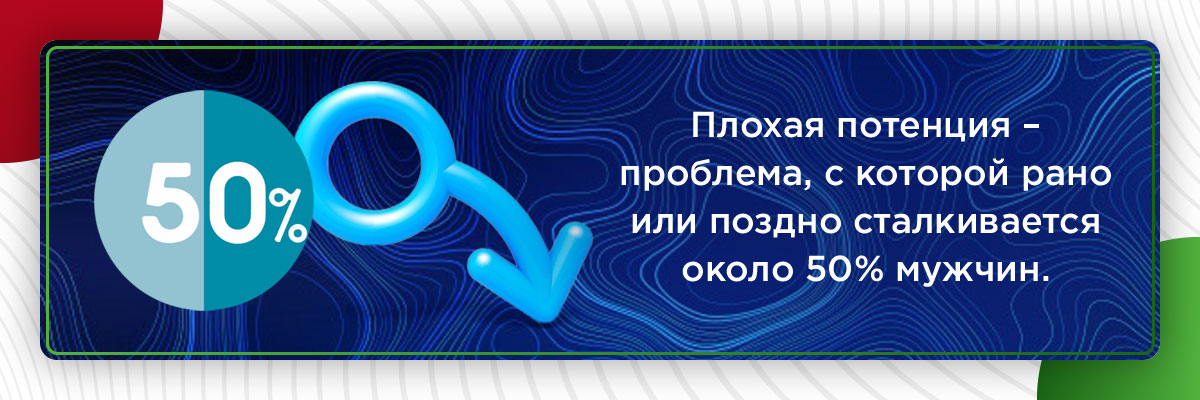 С проблемой ослабленной эрекции сталкивается огромное количество мужчин. Среди молодых это практически 10% населения, а среди людей старшего возраста – каждый второй. Все это связано с современным образом жизни, хроническими заболеваниями, нарушениями в работе сердечно-сосудистой системы и многими другими сопровождающими факторами.