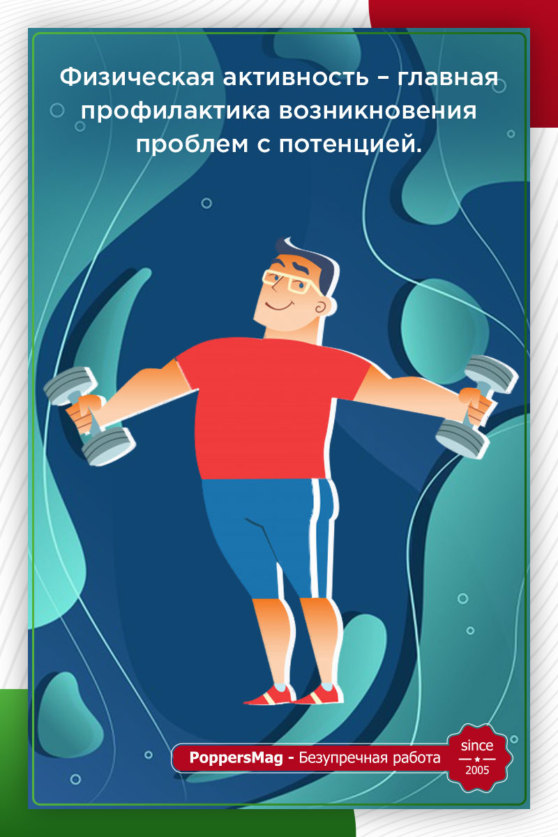 Не забывайте и о своем образе жизни. Мужчины, которые курят и употребляют в больших количествах алкогольные напитки, больше подвержены риску развития эректильной дисфункции. Также часто страдают от подобного заболевания и те, кто ведет малоподвижный образ жизни. Не стоит думать о том, что спорт нужен только для красивого внешнего вида. Физическая активность – главная профилактика возникновения проблем с потенцией.
